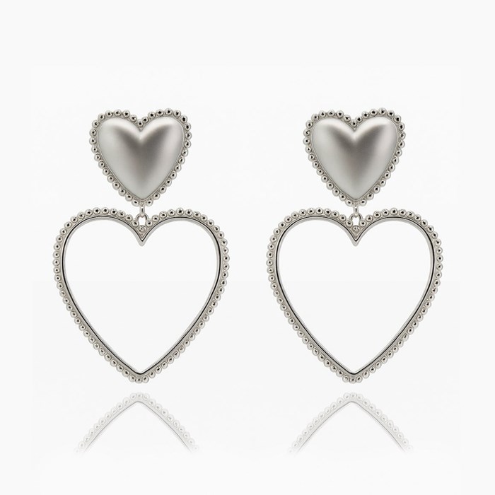 Верхнее дутое сердце из красивого матового металла, еле улавливая свет, красиво подчеркнет линию скул. А нижнее сердце-рамка в россыпи мелких шариков, находится в постоянном движении, создавая динамику украшения.